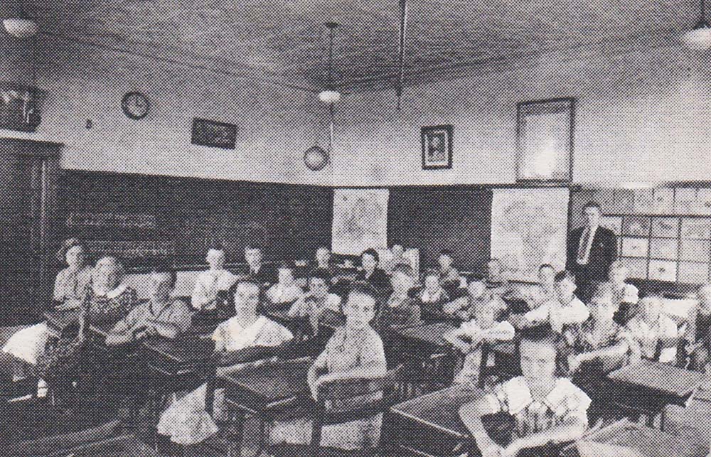 A split-level brick school was built on the site in 1932. It had a drinking fountain, a chemical toilet, one large classroom and a library.